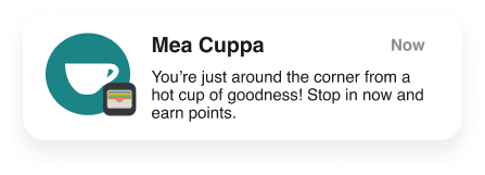 Just like a mobile app push notification, Vibes' mobile wallet platform can also deliver a variety of messages to a user’s lock screen, including precisely-timed notifications that can be set to automatically send when a user is 100 meters or less away from a physical location - and then prompting a visit to that nearby location.