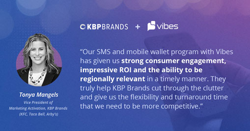 “Our goal has been to drive profitable sales, localize our marketing to compete more effectively and deliver increased value to our guests,” says Tonya Mangels, vice president of marketing activation, KBP Brands. “We’re moving fast to expand our SMS and mobile wallet program with Vibes because of strong consumer engagement, impressive ROI and ability to be regionally relevant in a timely manner. The text-to-enroll program is low risk, easy for consumers to join and delivers immediate advantages.”