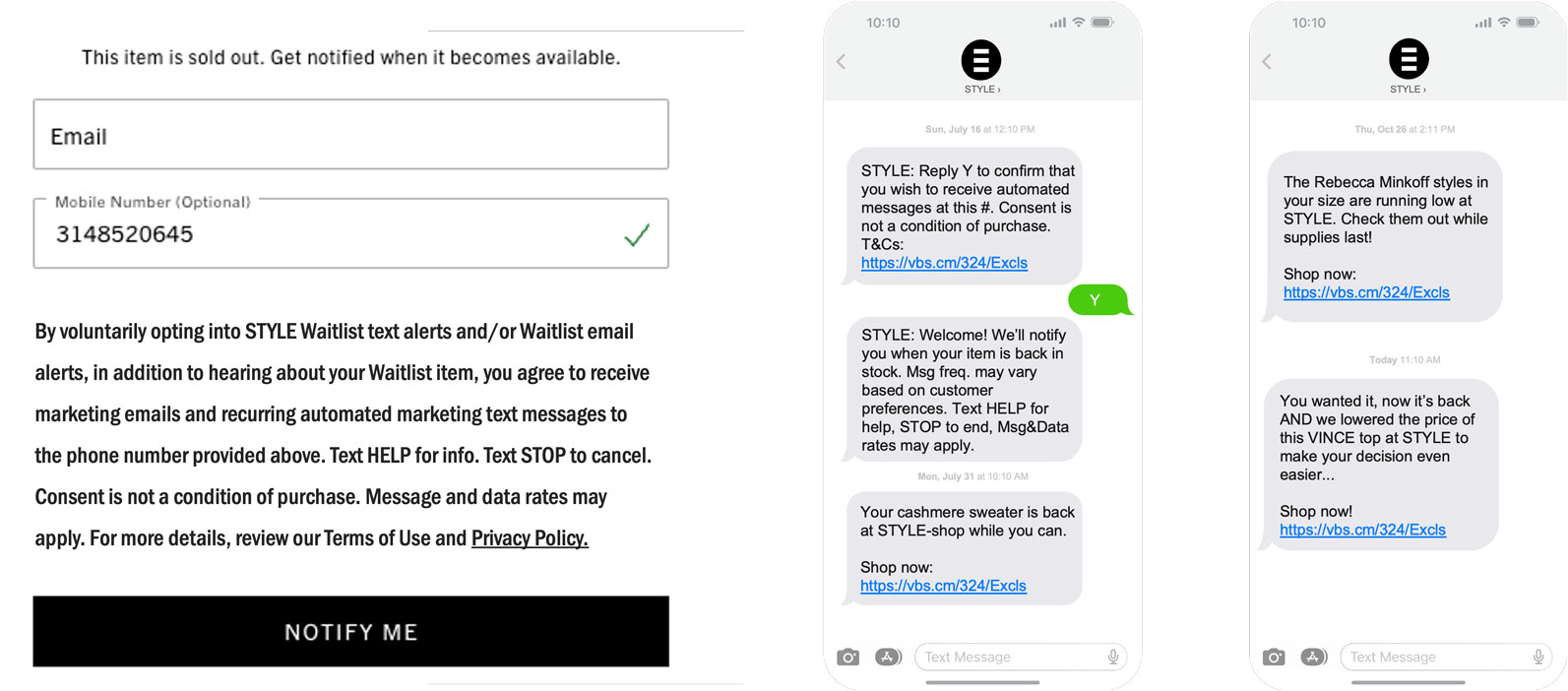 But one activation in particular that continues to drive much of their overall success with mobile: an SMS waitlist program where shoppers can sign up to receive text message notifications about any product that they found online that was not in stock. Once the product is back in stock and available to order, those shoppers immediately receive a text message with a link that allows them to make the purchase right away so that they don’t miss out.