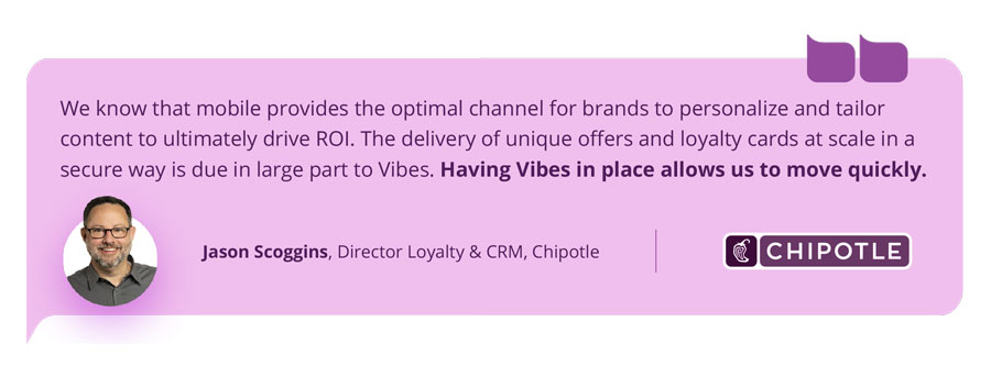 According to Apple, 30% of users that install a brand or business’ mobile wallet pass also downloaded their mobile app. With millions of active Rewards members engaging with their app-based program, Chipotle chose to team up with Vibes to integrate and manage the Chipotle Rewards loyalty pass directly in their mobile app. Now Chipotle Rewards members can access their digital loyalty card in their app or in their mobile wallet to scan and earn points anytime they make a purchase online or dining in.