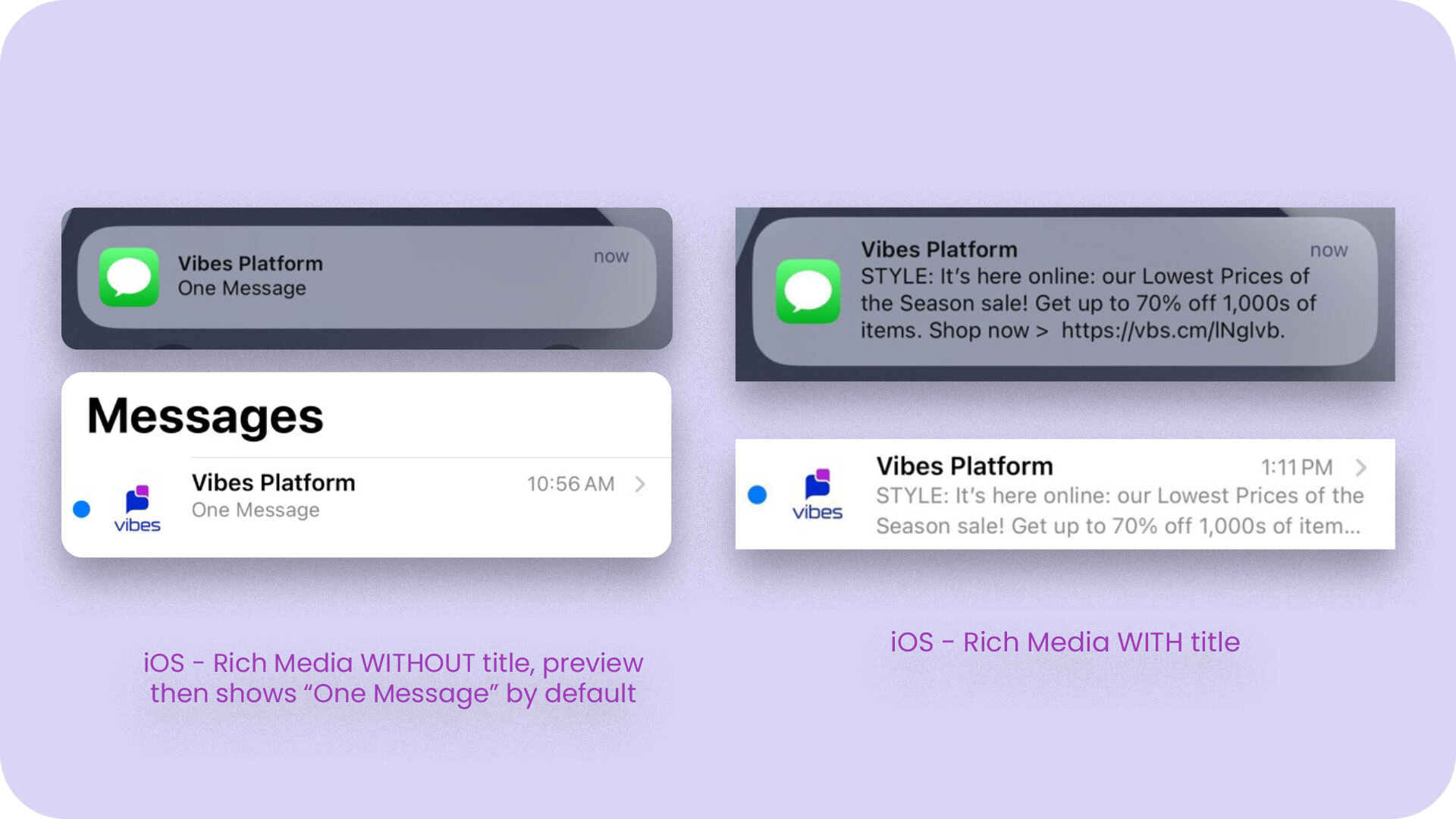 Specifically for iOS users, Vibes recommends including the most relevant information within the first 100 characters of the description since the full message may be truncated based on device type, font size or other variable factors.