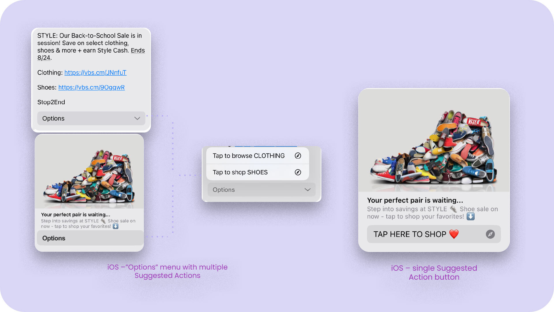 2. Prioritize one Suggested Action button. Since Suggested Actions appear in a dropdown menu within the iOS rich card itself, if you include more than one Suggested Action in your rich card, the dropdown box with read "Options", requiring the user to click on it to see the suggested call-to-action buttons. By including only one Suggested Action per rich card, it eliminates that extra click in order for your customers to see what action to take next.