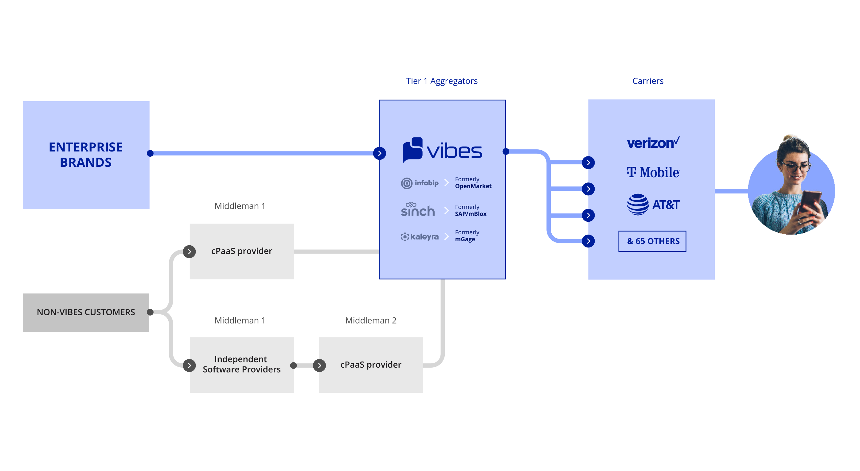 Once a message is created in a mobile platform, it typically needs to be sent to one or more aggregators before being sent to the carriers, who then send the message to the consumer. That’s at least 3 touchpoints, each with their own throttle, which refers to the number of messages they can send per second before the message reaches a brand's customers.